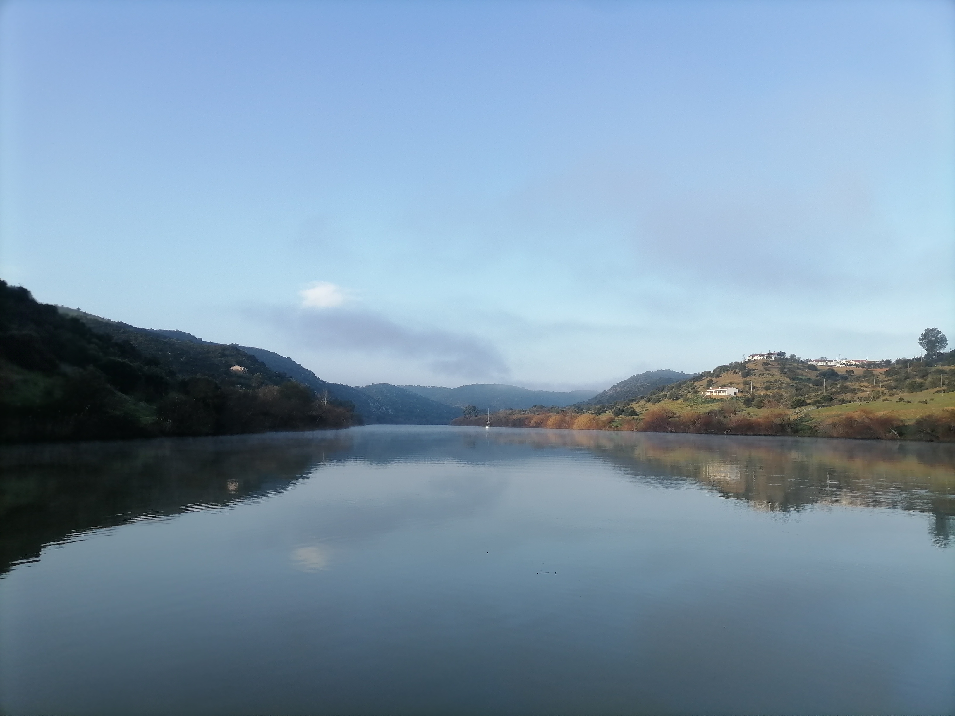 J’appréhende le démarrage du moteur par ce froid et une potentielle fuite sur le circuit gasoil à cause de ce rafistolage. Je m’éclipse cinq minutes pour profiter une dernière fois des toilettes de Pomarão, à mon retour le moteur tourne comme une horloge. Apparemment il a eu un peu de mal au démarrage, mais rien d’inquiétant. Nous larguons les amarres en temps et en heure. Les hérons, cormorans, et aigrettes du Rio sont déjà réveillés et regardent la Baleine traverser leur territoire. Ici le Rio est plus sauvage, par endroit les falaises tombent directement dans la surface de l’eau. Des petites îles verdoyantes apparaissent le long des berges. Nous croisons les premiers murets de pierres construits par les romains de chaque coté du Rio. Ils dépassent d’1m la surface de l’eau et forment une sorte d’entonnoir de l’amont vers l’aval. D’après Jorge les romains les ont construits pour accélérer le flux du courant et ainsi améliorer le désenvasement du fleuve lors des grandes crues. Aujourd’hui, cela se fait mécaniquement puisque le grand barrage d’Alqueva contrôle le flux du fleuve et prévient les grandes crues et les inondations. Selon les pêcheurs, l’eau est aussi de moins bonne qualité car il y a moins de courant et donc moins de poissons.