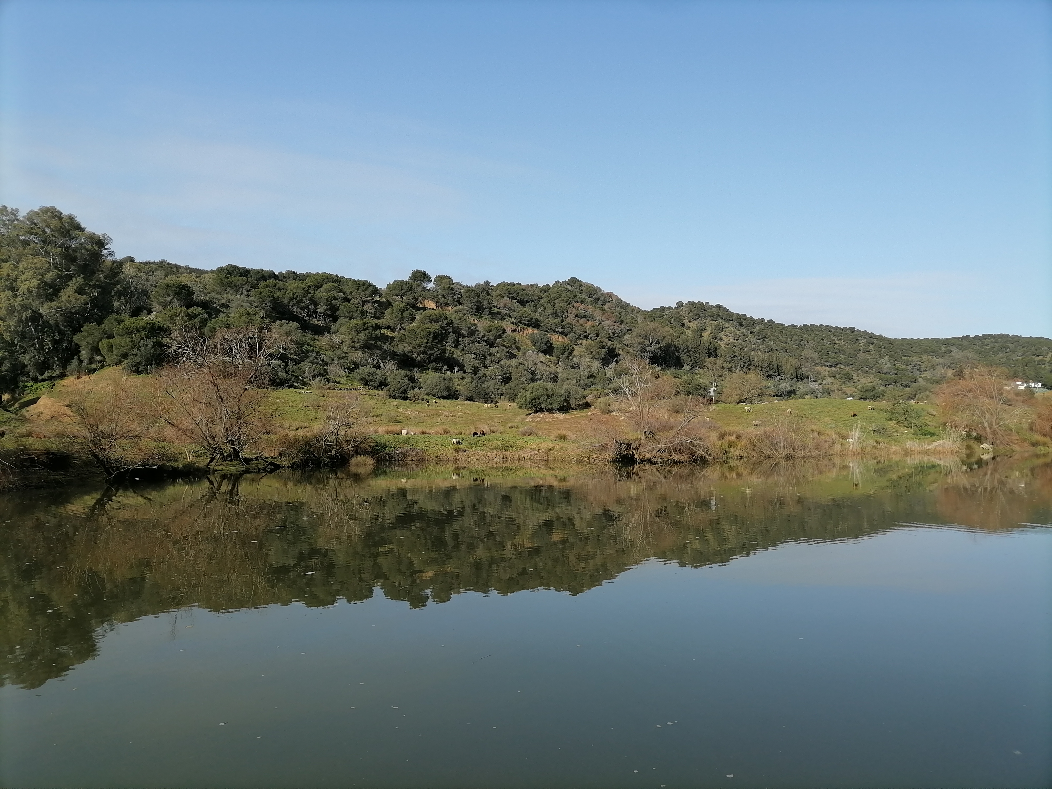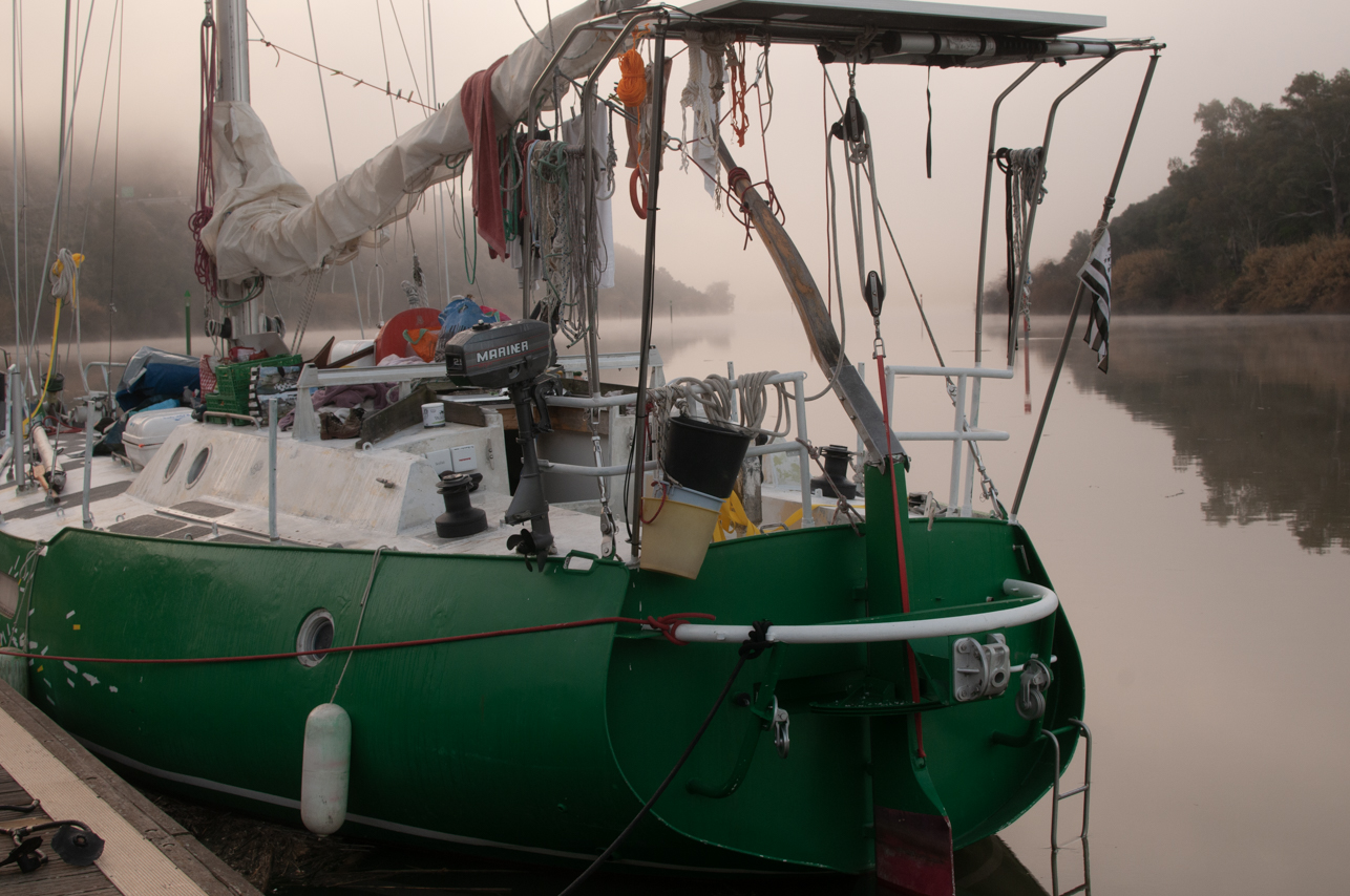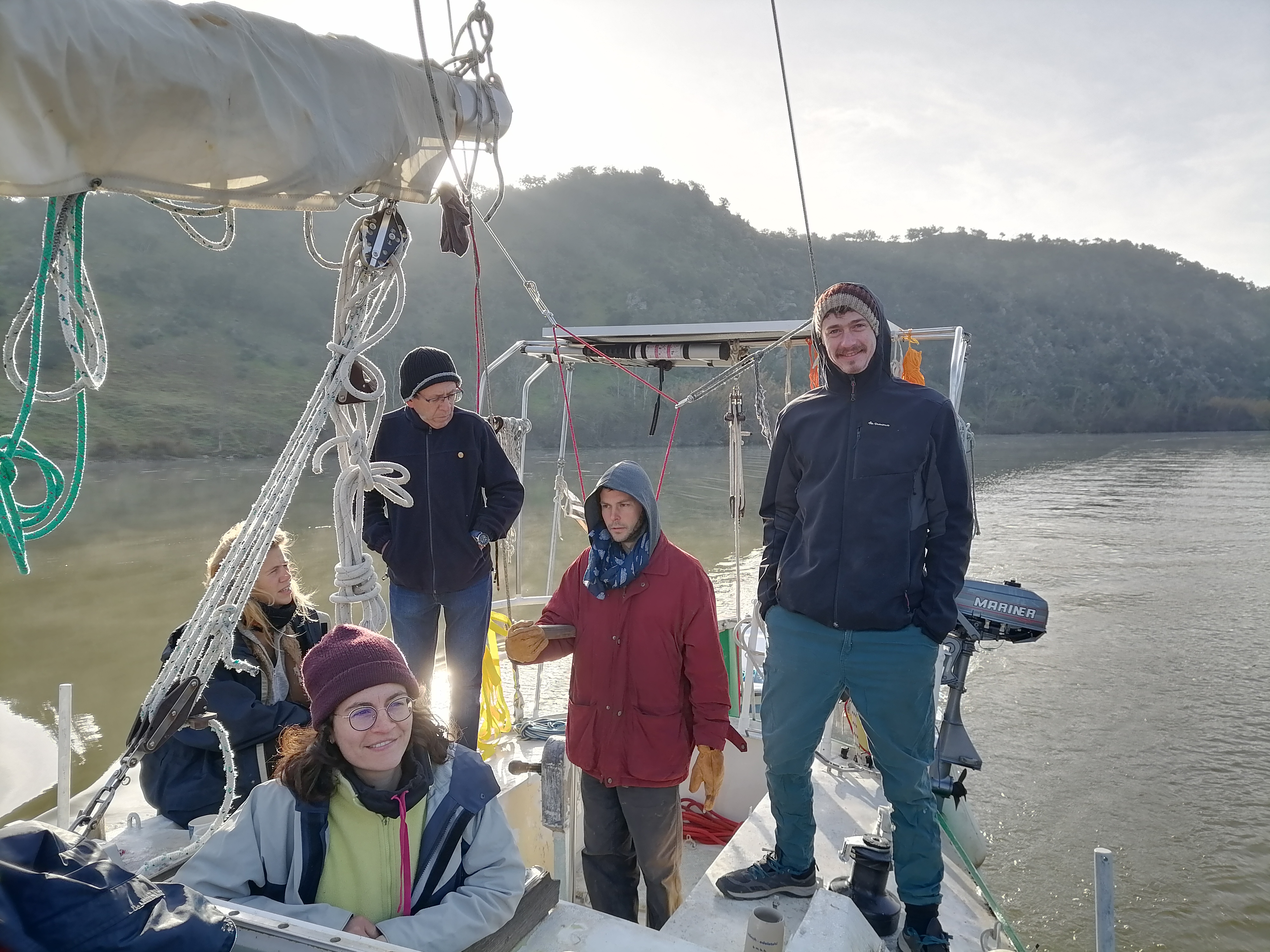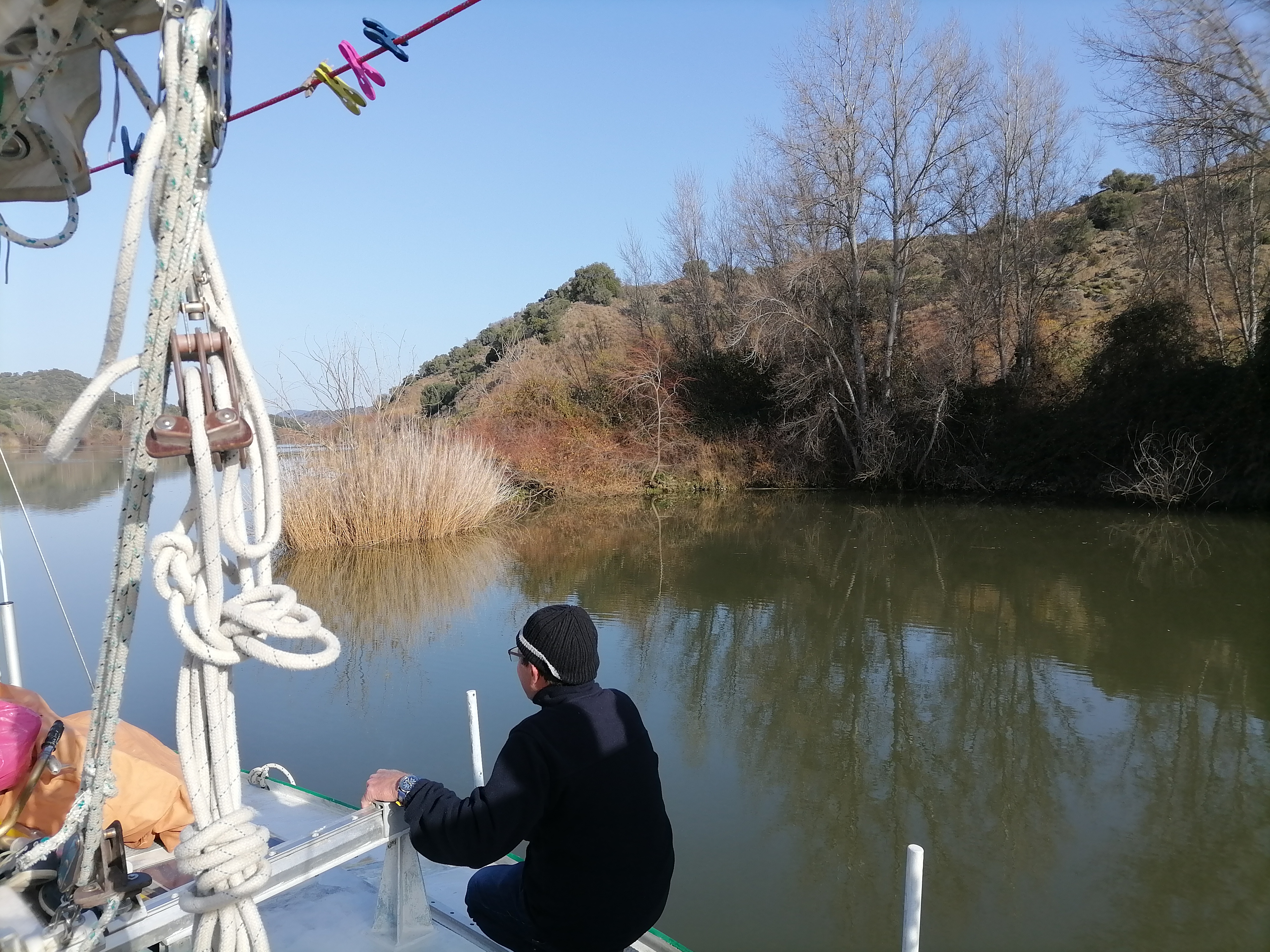 Il fait froid ce jour-là lorsque je me lève vers sept heures du matin, horaire portugaise, pour préparer une casserole de porridge accompagné d’amandes locales pour l’équipage. Il est rare d’avoir des températures si fraîches au mois de février à Pomarão, un petit village portugais où vit une trentaine d’habitants. Le hameau se trouve le long du Rio Guadiana, juste à l’endroit où celui-ci cesse de faire la frontière sud entre l’Espagne et le Portugal. En amont de Pomarão les deux rives du fleuve sont portugaises, jusqu’au grand lac artificiel d’Alqueva une centaine de kilomètres plus haut. Ensuite, le fleuve fait à nouveau frontière sur 50 kilomètres, puis retourne en Espagne. Ce matin nous avons prévu de naviguer jusqu’à Mértola, la dernière ville du Rio Guadiana accessible en voilier, elle se trouve tout de même à 35 milles de l’embouchure du fleuve. Environ deux heures de navigation à moteur séparent Pomarão de Mértola, le chef lieu du secteur, d’après Jorge, notre guide du jour. L’accès n’est possible qu’à marée haute, il n’existe pas de cartes précises du Rio après Pomarão, et le balisage s’arrête également où nous nous trouvons. Cinq milles en aval de Mértola de dangereux rochers, immergés à marée haute, sont éparpillés dans le lit du fleuve. Il est donc conseillé de remonter le fleuve accompagné d’un guide pour éviter de taper les cailloux avec son bateau. Les navires à fort tirant d’eau sont donc fortement handicapés dans cette navigation. Jorge nous raconte qu’une fois il a aidé un ami espagnol à remonter le fleuve avec son voilier d’1m90 de tirant d’eau, mais qu’il ne le referait pas de si tôt. Sur la Baleine, lorsque safran et dérive sont relevés il ne reste plus qu’1m20 de hauteur de coque dans l’eau, nous ne devrions donc pas avoir de problèmes.