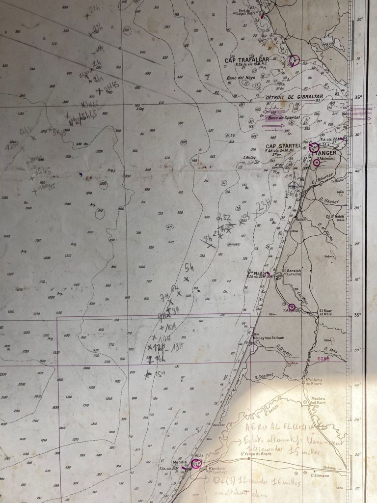 C’est réconfortant d’avoir des amis à bord : nous devions embarquer Nabil notre pote casaoui avec nous pour cette navigation, mais la géopolitique mondiale lui a empêché de venir avec nous. Impossible pour lui, sans visa, de monter sur notre bateau français. C’est comme si nous voyagions avec un bout de notre territoire national, même loin de notre chère patrie il nous est interdit d’accueillir qui nous voulons à bord ! Eh oui Madame, la loi c’est la loi, m’a dit le chef de l’Immigration à Tanger… Bon, si nous replaçons dans le contexte, Tanger et le Détroit de Gibraltar est une zone extrêmement tendue par les passages clandestins, de passagers et de marchandises, vers l’Europe. Seulement 14 km.. Comment peut-on vivre avec, devant ses yeux, l’Espagne, le rêve européen à seulement 14 km !? C’est seulement les jours de brouillard qu’on n’aperçoit pas la côte espagnole depuis Tanger.