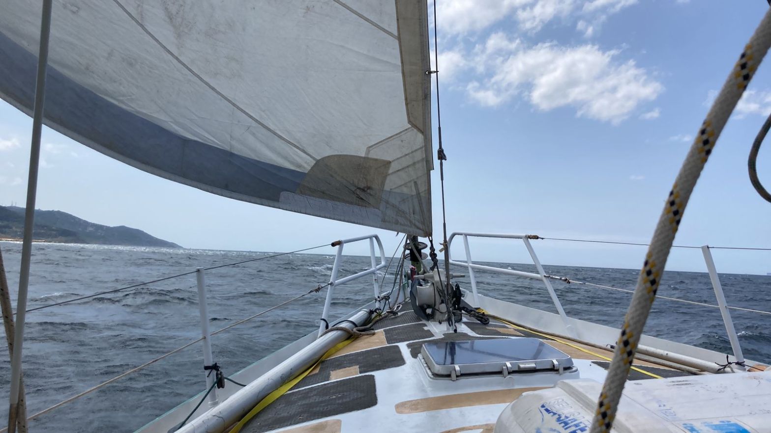 Je me suis réveillée à 10h et on était encore devant Casa. Ça me fait penser à Nabil en plus. Quel monde de merde ! Je prends la barre. Le soleil est fort. Je m’installe un coin confort pour barrer, avec des coussins, à l’ombre du panneau solaire. Ça donne presque envie d’arrêter le bateau et de piquer une tête. Tout le monde se réveille petit à petit. C’est comme si le bateau dormait aussi avec les autres et que quand ils se réveillent, il reprend vie aussi. J’aime bien ces moments. François, Lucie, Quentin me rejoignent, on hésite à affaler le spi (cette grande voile en toile de parachute) qui est hissé depuis le matin. Mais au même moment, le vent reprend, Youpi ! « Le spi fait son office » comme disent nos amis belges, alors c’est reparti !