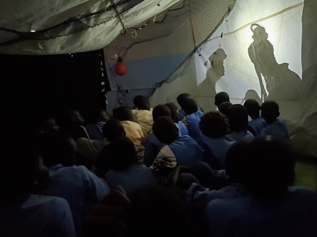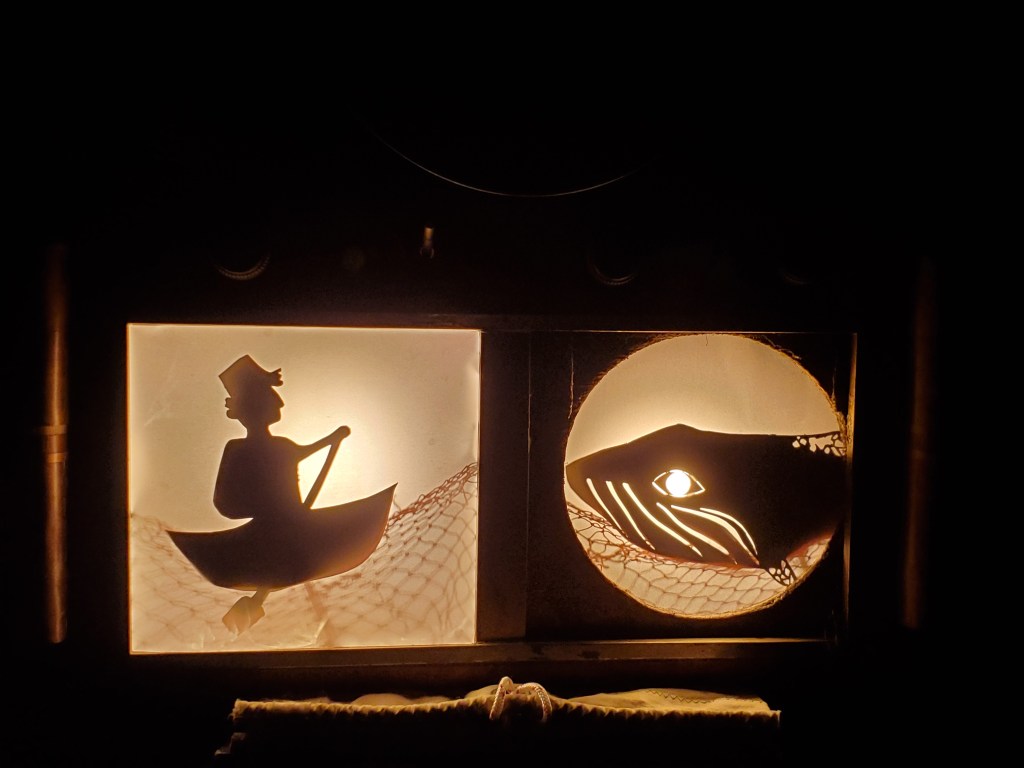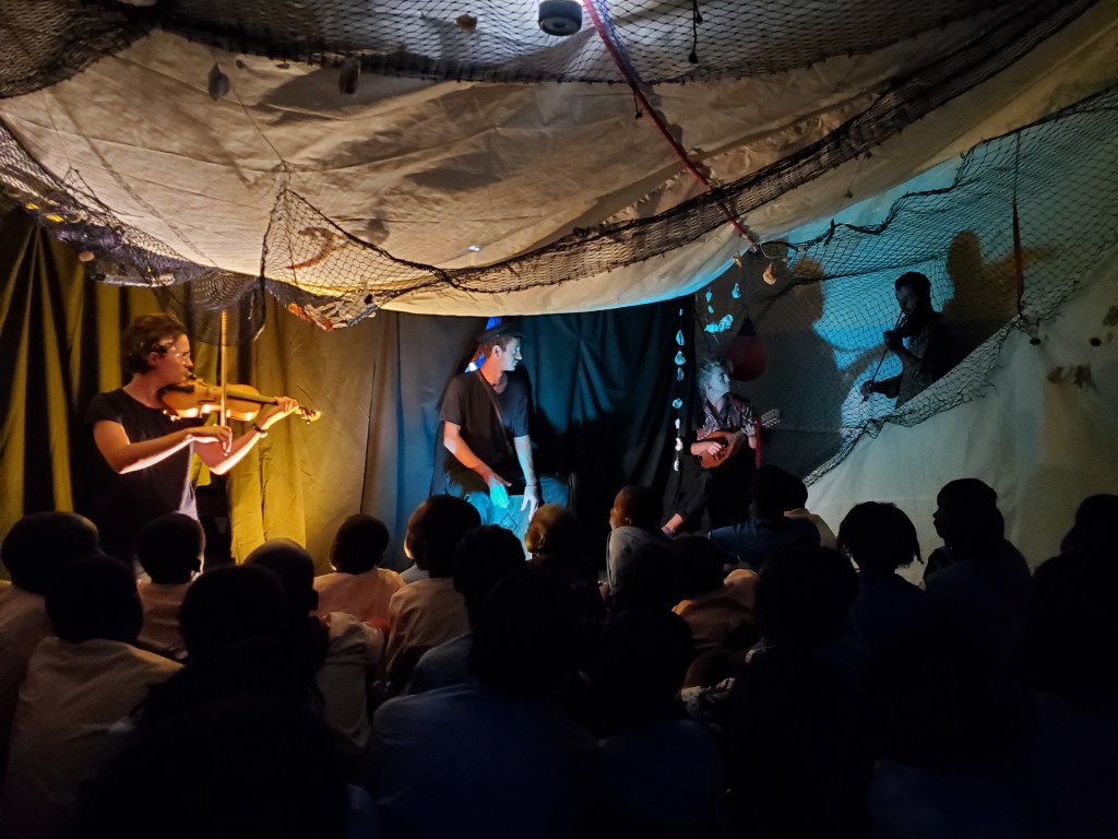 Le public est invité à rentrer dans le ventre d’une baleine et à plonger dans une ambiance sous marine où sont diffusées des histoires bien terrestres car ce cétacé colporte des histoires de vies des personnes que l’équipe de Mégafaune rencontre dans les ports au fil de son trajet.